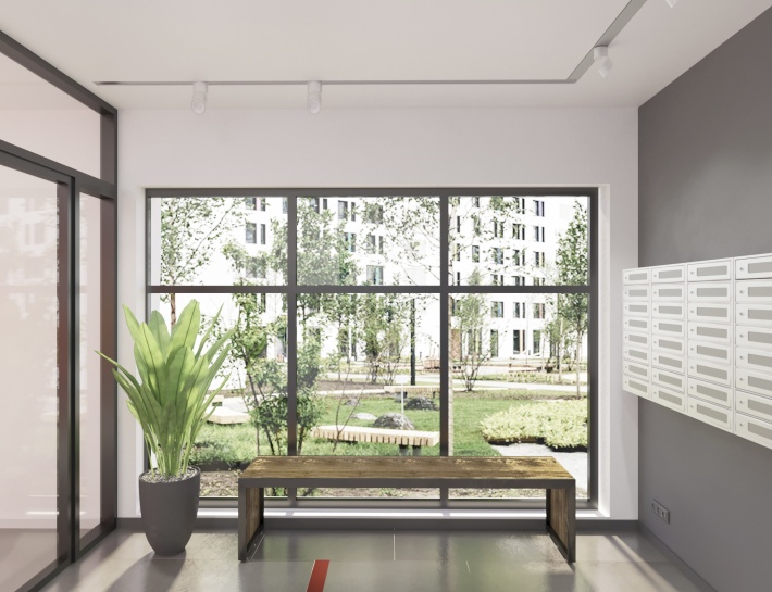 Войти в свою секцию можно из двора или с улицы. Входы организованы на уровне земли, чтобы было удобно родителям с малышами и пенсионерам. В подъездах будет светло за счет витражного остекления и уютно благодаря дизайнерской отделке.